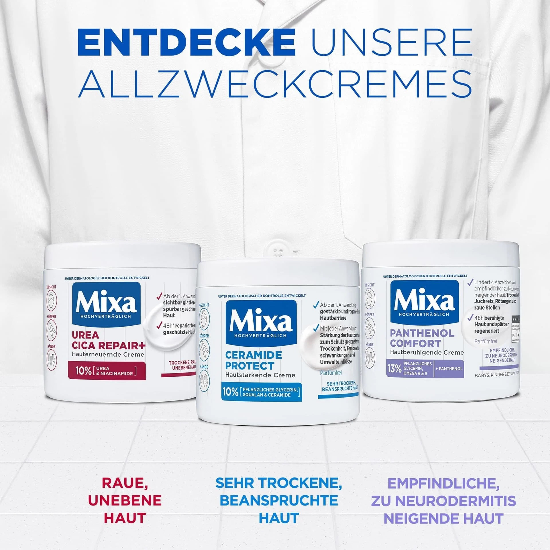 - مناسب برای پوستهای خیلی خشک، زبر و حساس: کرم تقویت کننده و رطوبترسان میکسا حاوی سرامید مخصوص افرادی است که پوستشان بسیار خشک یا واکنشپذیر است. ترکیبات آن بهگونهای انتخاب شده که ملایم، ضدحساسیت و بدون ایجاد سوزش باشد، حتی روی نواحی آسیبدیده یا خارشدار. بنابراین میتوان با خیال راحت آن را در روتین مراقبت از پوست استفاده کرد.