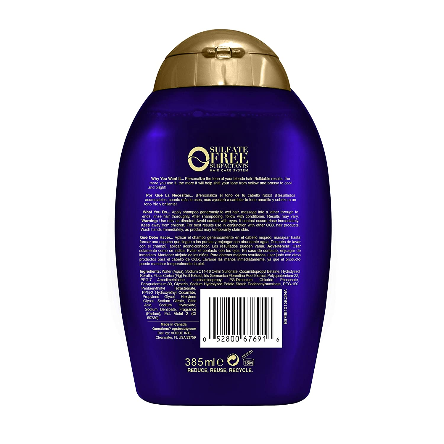 شامپو او جی ایکس OGX مدل Blonde Enhance + Purple Toning یک شامپوی تخصصی ضد زردی است که برای موهای بلوند، دکلره، پلاتینه، خاکستری و نقرهای طراحی شده است. این شامپو با داشتن پیگمنتهای بنفش، تناژ زرد و نارنجی ناخواسته مو را خنثی کرده و رنگ مو را شفاف، سرد و درخشان نگه میدارد.فرمولاسیون این محصول فاقد سولفاتهای مضر بوده و بدون آسیب به ساقه مو، به حفظ رطوبت و سلامت مو کمک میکند. وجود عصارههای مغذی در شامپو OGX باعث میشود موها پس از شستشو نرم، خوشحالت و براق شوند. استفاده منظم از این شامپو، ماندگاری رنگ بلوند را افزایش داده و از کدر شدن مو جلوگیری میکند.