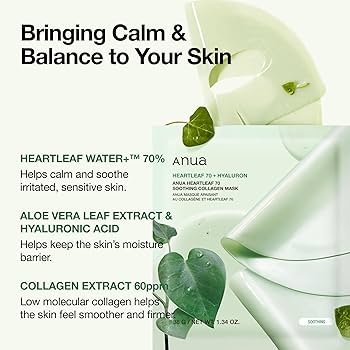 یکی از ویژگیهای برجسته ماسک ورقه ای تسکین دهنده و آبرسان آنوا، وجود ۷۰٪ عصاره گیاه هوتوینیا کورداتا (Heartleaf) است که بهدلیل خاصیت تسکیندهنده، ضدالتهابی و آنتیاکسیدانی خود، برای پوستهای حساس و مستعد قرمزی بسیار مناسب است. این عصاره به متعادلسازی چربی پوست، کاهش التهاب و تقویت سد محافظتی پوست کمک میکند.