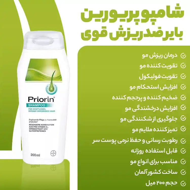 شامپو ضد ریزش پریورین (Priorin) محصولی از برند معتبر بایر آلمان است که برای مقابله با ریزش مو و تقویت رشد آن طراحی شده است. این شامپو با ترکیب خاصی از عصارههای گیاهی و ویتامینها، به تقویت ساختار مو، افزایش حجم و درخشندگی آن کمک میکند.