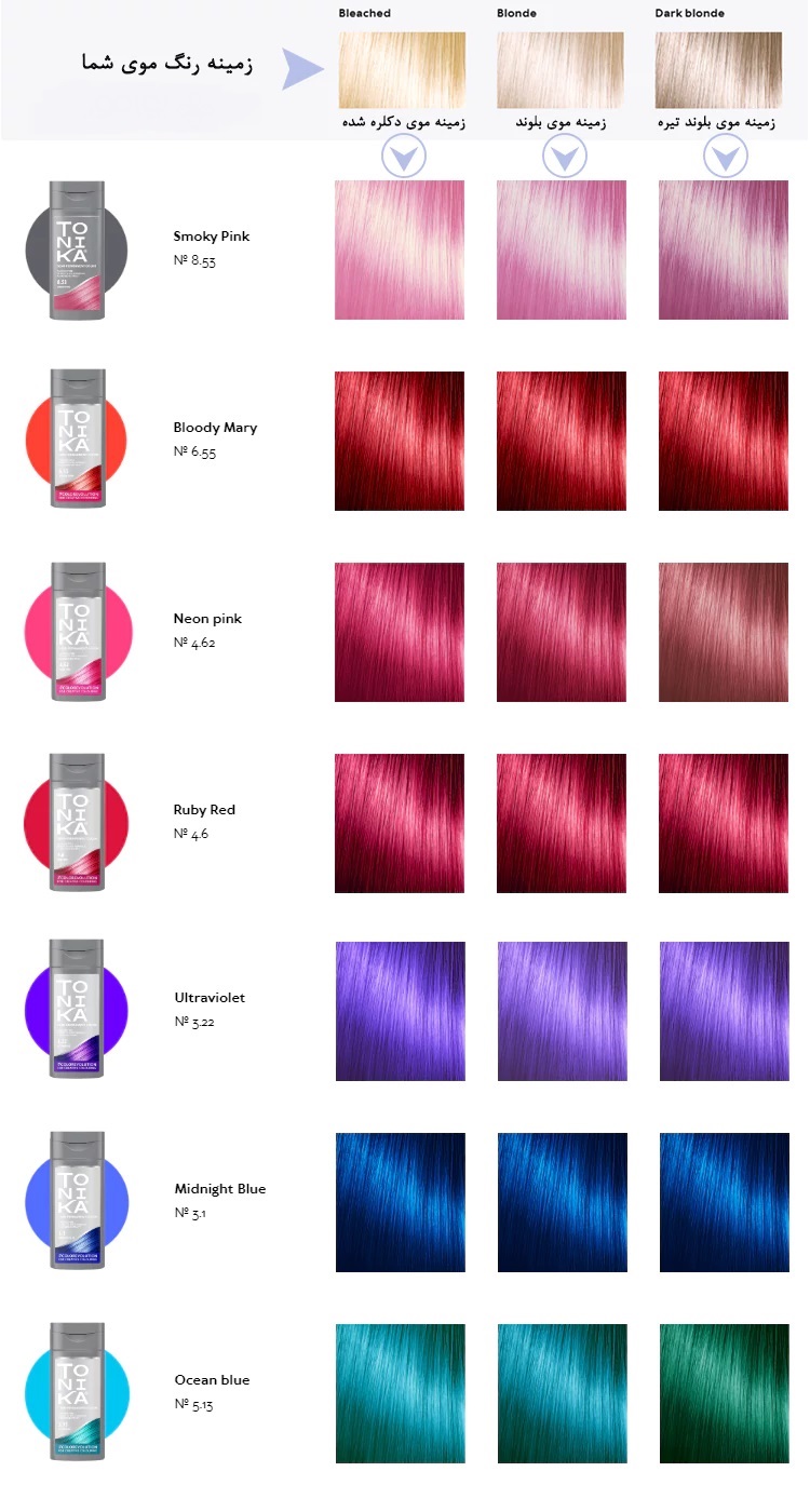 - همیشه در انتخاب رنگ تونر تونیکا زمینه اصلی موی خود را در نظر بگیرید. به عنوان مثال: اگر موهای شما تیره است، باید نزدیک ترین تن (یا 2 تا 3 تن تیره تر) را به رنگ طبیعی خود انتخاب کنید.